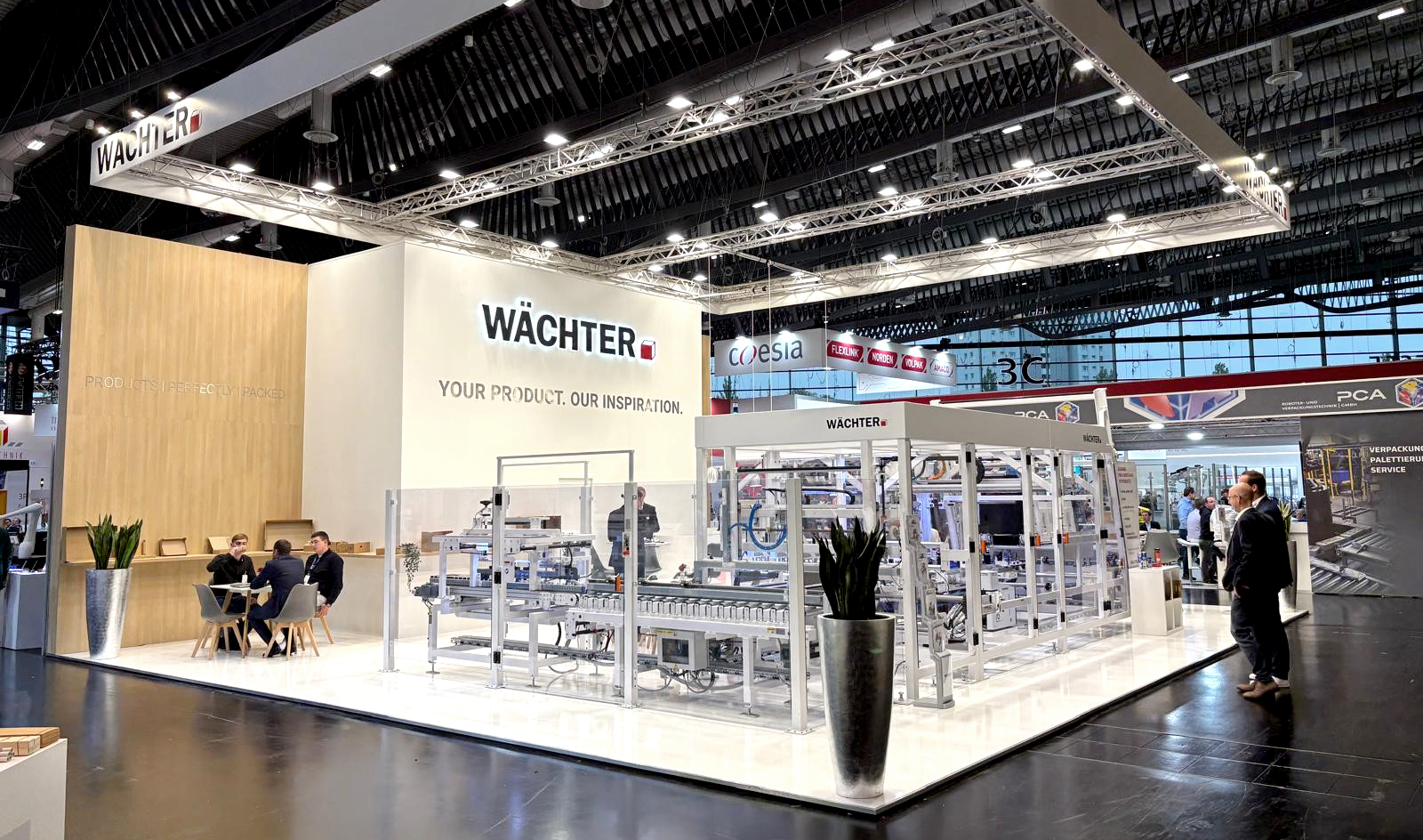 Ein besonderes Highlight war die Live-Präsentation unseres modularen Wrap-Around-Packers, der für die effiziente Verpackung von Fußboden- und Regalböden konzipiert wurde – und gleichzeitig zeigt, was unsere Technologie auch für andere Branchen leisten kann.